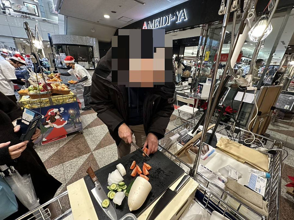 今回のクリスマスイベントのような「刃物に直接関係のないイベント会場」での実演販売は、いつ・誰が・なにを求めて来るのかということがわからないため、アドリブ感のようなものがあり、包丁教室とは違った緊張感を体験できます。